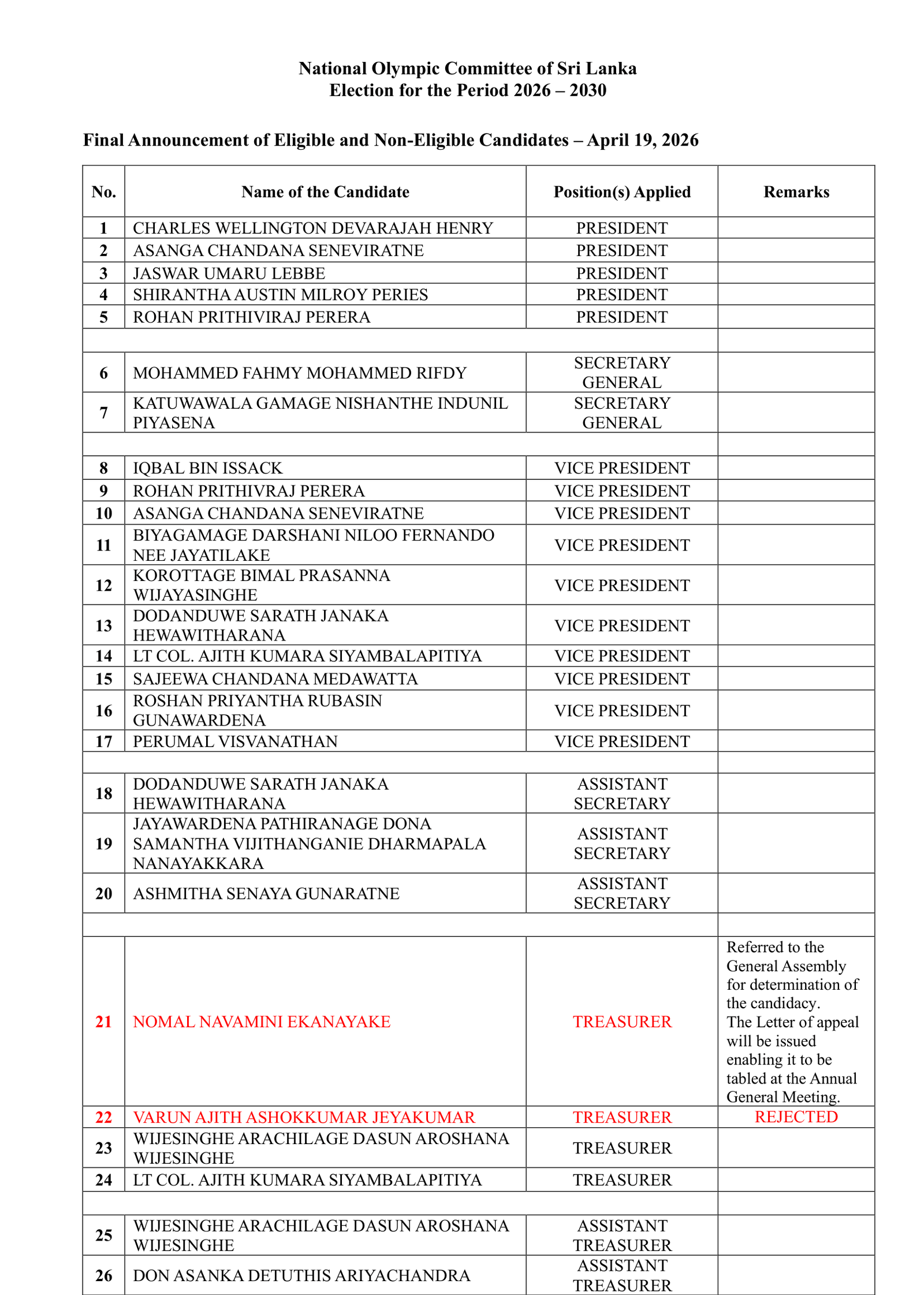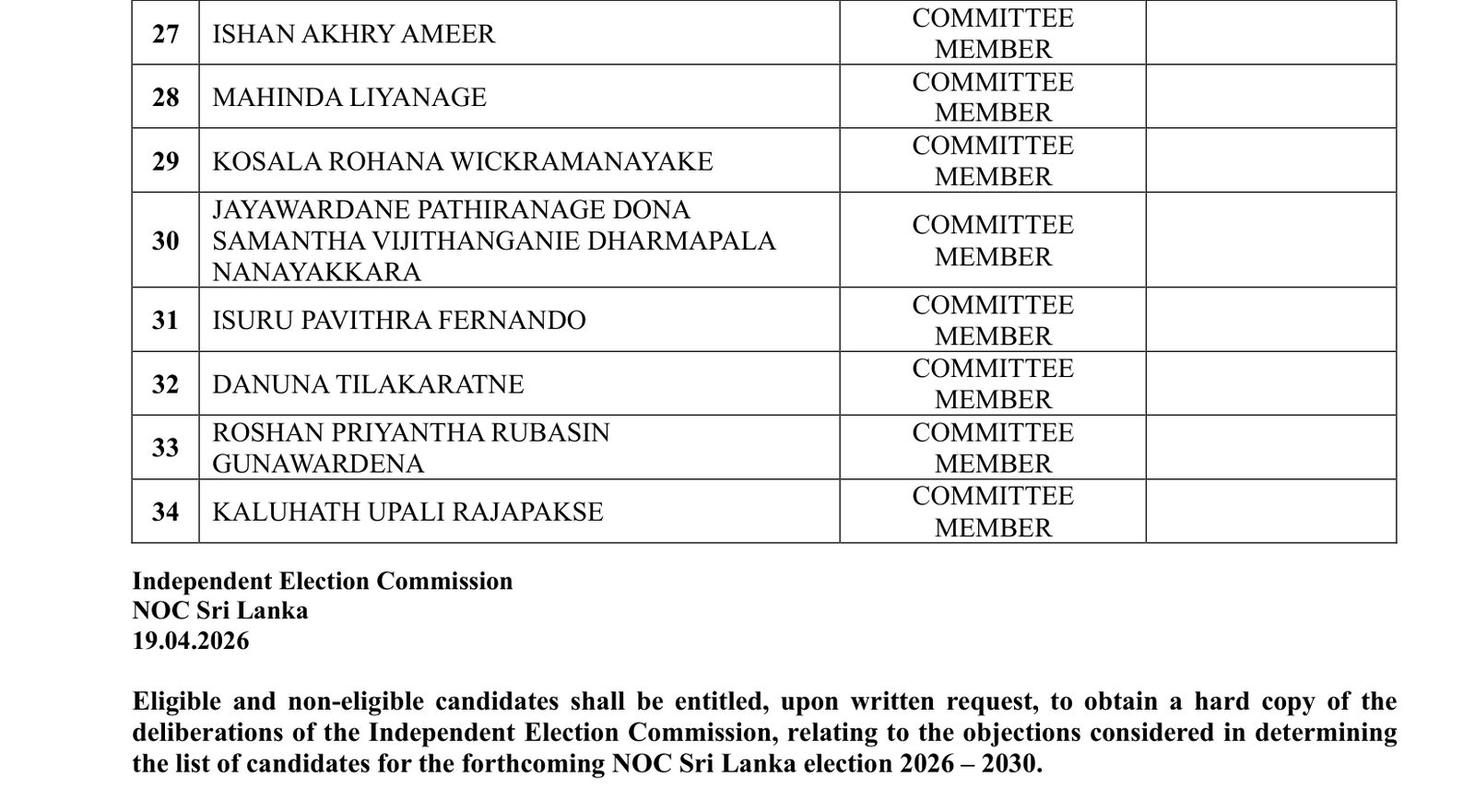 NOC Sri Lanka Election for the Period 2026 – 2030 - Final Announcement of Eligible &  Non-Eligible Candidates - April 19, 2026